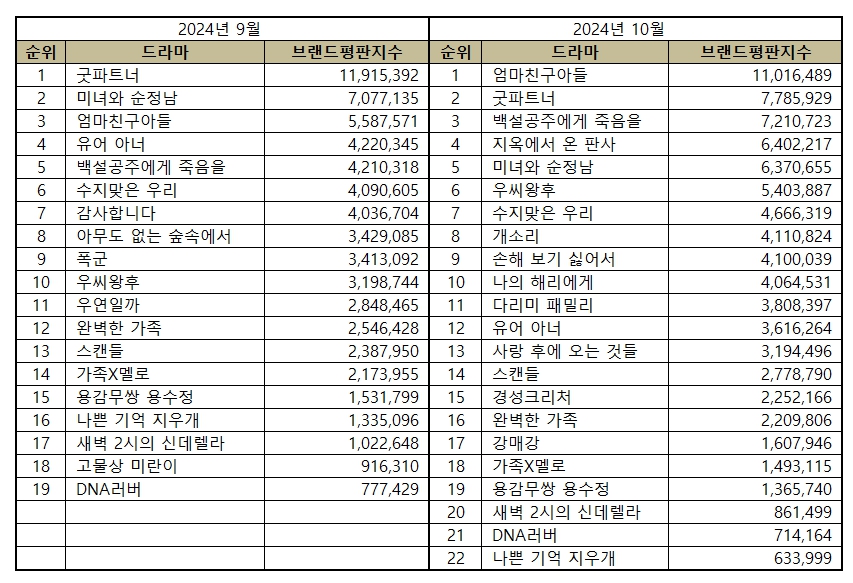L’Institut coréen de recherche sur la réputation des entreprises a récemment publié son classement des dramas les plus populaires pour le mois d’octobre 2024, basé sur une analyse détaillée du Big Data. Ce classement met en avant les séries télévisées les plus appréciées par le public, en se basant sur des critères tels que la participation des consommateurs, la consommation des médias, et la communication autour des marques.