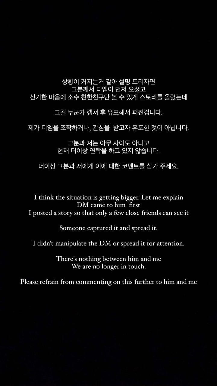 En réponse à la situation, la femme qui a reçu les DMs a adressé une déclaration demandant aux fans de ne pas aggraver la situation. Elle a expliqué que ses story posts sur Instagram n’étaient pas destinés à être vus par le public et a appelé chacun à respecter sa vie privée.