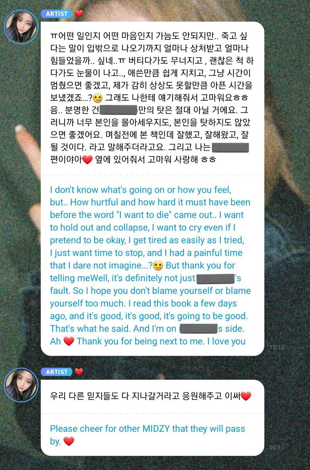 Dans son message suivant, elle a appelé les fans à faire preuve de bienveillance envers les autres MIDZY qu’ils pourraient rencontrer en écrivant : « Encouragez et soutenez les autres MIDZY que vous pouvez rencontrer. »