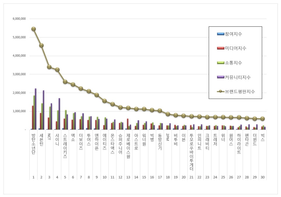 Stray Kids (Bang Chan, Lee Know, Changbin, Hyunjin, Han, Felix, Seungmin, I.N) complète le top 5 avec un indice de 2 599 566 points, en hausse de 4,70% par rapport au mois précédent. Leur popularité est amplifiée par leur réputation de performers énergiques et créatifs.