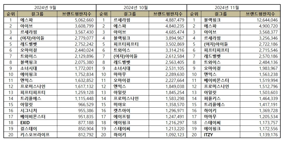 Ces résultats montrent que BLACKPINK domine le classement de novembre avec une forte croissance, tandis que aespa et IVE maintiennent leur influence. Ces trois groupes reflètent la dynamique actuelle de l’industrie de la K-pop féminine, et leur popularité reste incontestée dans divers médias et plateformes communautaires.
