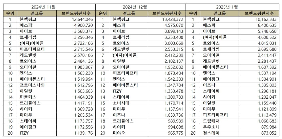 Le Korea Business Research Institute a publié son rapport sur la réputation des groupes féminins pour janvier 2025. L’analyse repose sur 63 644 284 données collectées du 12 décembre 2024 au 12 janvier 2025, mesurant la participation des consommateurs, la couverture médiatique, la communication et l’engagement communautaire autour des groupes. Par rapport à décembre dernier, le volume de données a augmenté de 2,72 %.