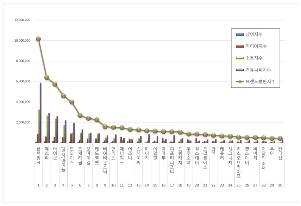 IVE (Ahn Yu-jin, Gaeul, Lay, Jang Won-young, Liz, Lee Seo) enregistre une augmentation de 47,43 % grâce à ses hits et ses apparitions médiatiques.
