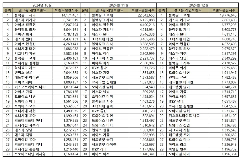 Pour établir ce classement, l’institut a analysé les participations des consommateurs, l’exposition médiatique, les interactions en ligne et les discussions au sein des communautés. Par rapport aux données de novembre, une hausse de 3,92 % a été enregistrée, témoignant d’un intérêt croissant pour les idols féminines au cours de ce mois.