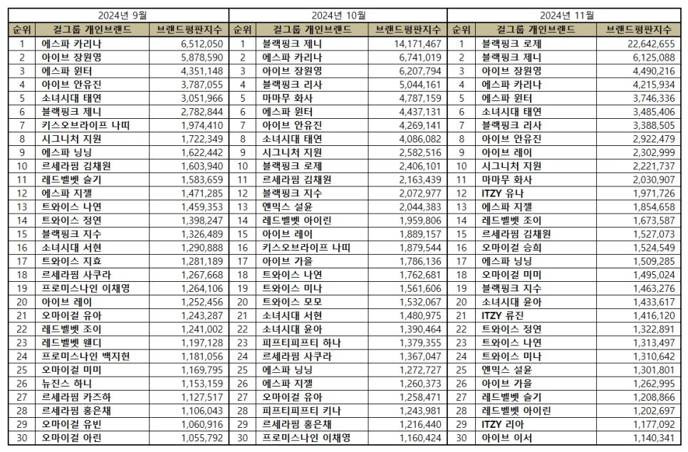 - Détails : Malgré une baisse de 56,78 % par rapport à octobre, Jennie conserve une place solide grâce à sa popularité constante et sa forte notoriété internationale.