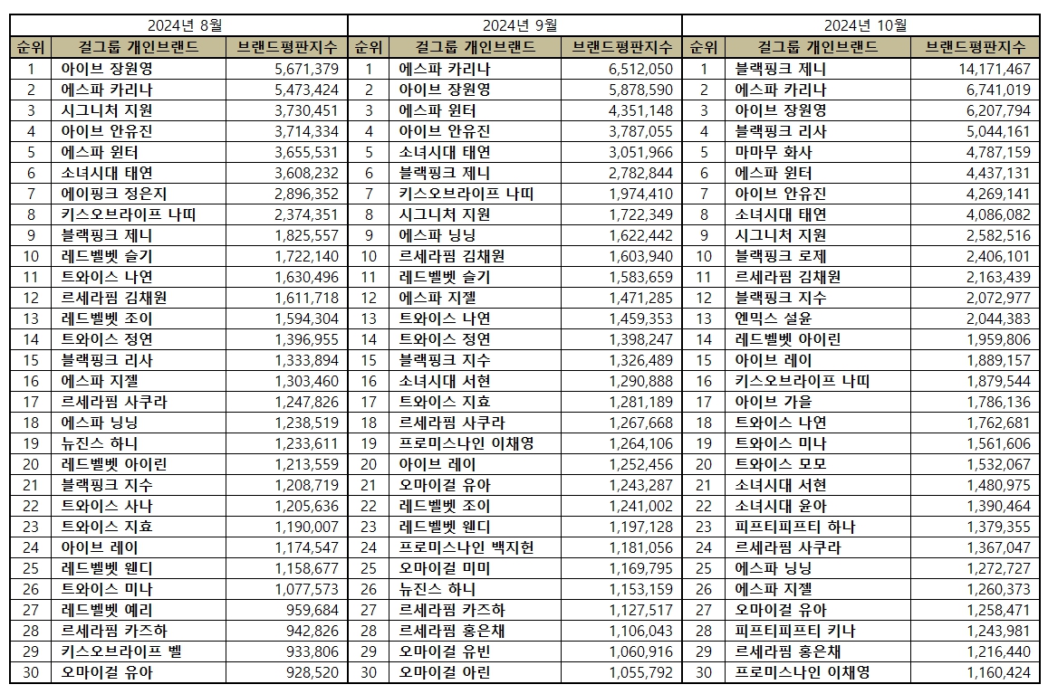 Le classement de la réputation des marques en octobre 2024 reflète l’influence croissante des membres des groupes de filles sur la scène musicale coréenne et internationale. Jennie domine cette édition grâce à son retour solo réussi avec « Mantra ». Karina et Jang Won-young confirment également leur popularité constante, tandis que des artistes établies comme Lisa, Hwasa, et Taeyeon continuent de briller.