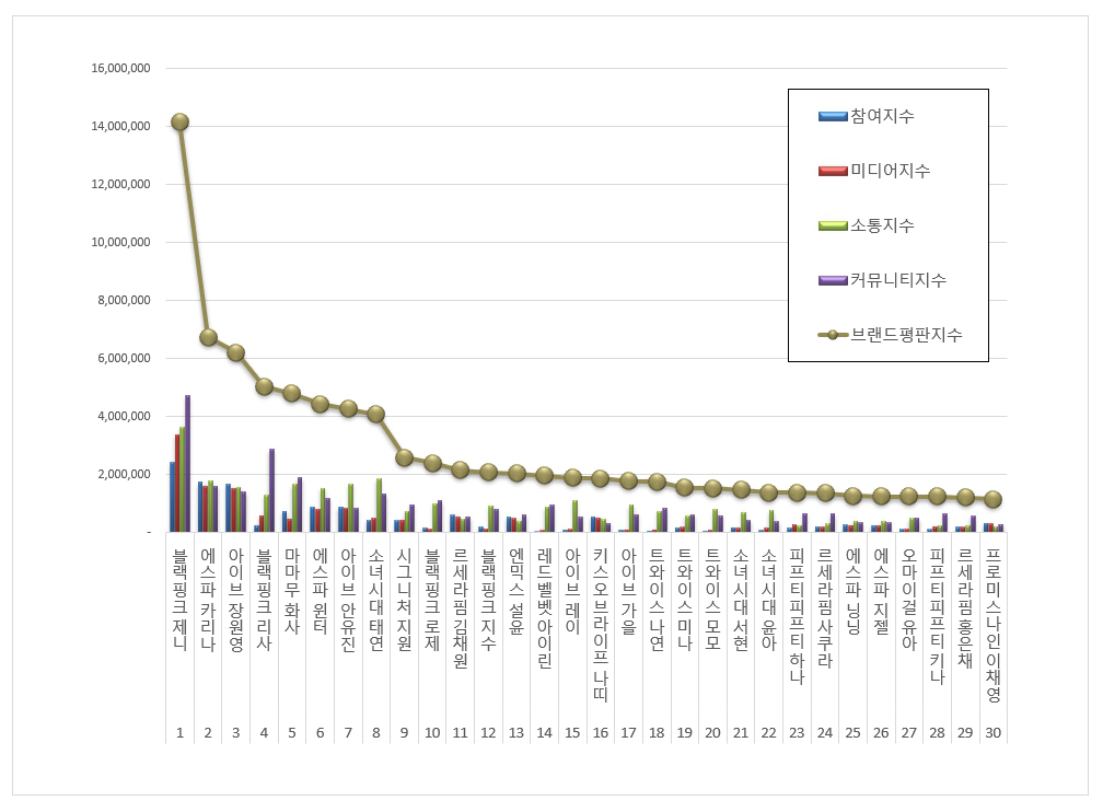 L’analyse a été réalisée sur 135 672 895 éléments de Big Data recueillis auprès de 680 membres de groupes de filles entre le 20 septembre 2024 et le 20 octobre 2024. Les indices de réputation de la marque ont été évalués selon quatre critères : l’indice de participation, l’indice des médias, l’indice de communication et l’indice communautaire. Comparé à l’analyse précédente, le volume de données a augmenté de 35,34 %, démontrant l’intérêt croissant pour les membres des groupes de filles en Corée du Sud.