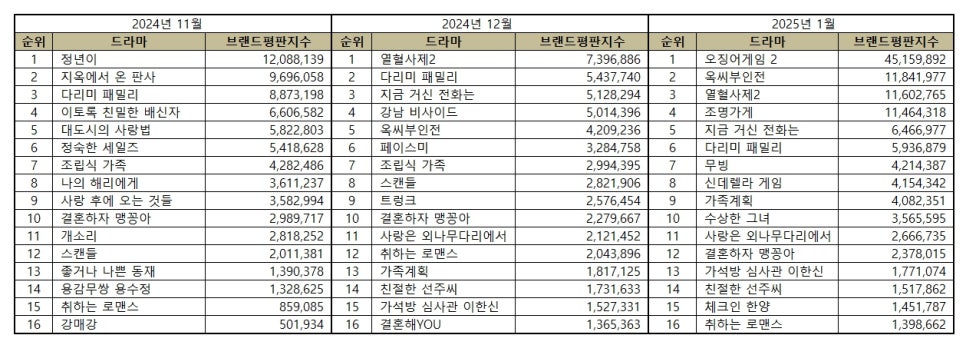 L’institut de recherche sur la réputation des entreprises en Corée du Sud a publié les résultats de son étude sur la réputation des dramas pour le mois de janvier 2025. En tête du classement, Squid Game 2 domine largement, suivi par Oksi Buin Jeon et The Fiery Priest 2.