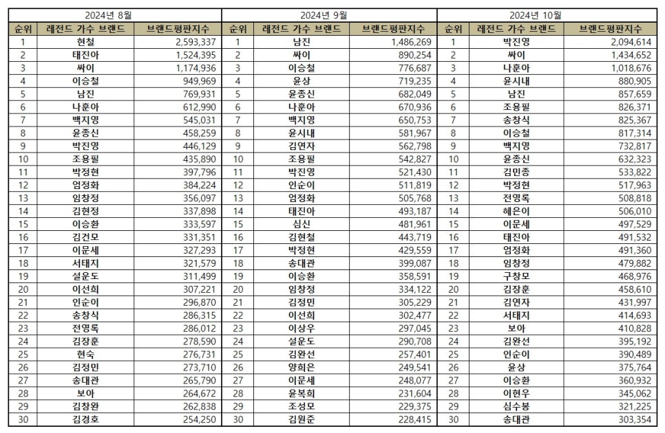 En octobre 2024, les légendes de la musique coréenne continuent de captiver les fans et de laisser une marque indélébile sur l’industrie musicale. L’Institut coréen de recherche sur la réputation des entreprises a récemment publié une analyse détaillée du Big Data concernant les artistes légendaires, révélant les dix chanteurs qui dominent le paysage musical en termes de popularité et de reconnaissance.