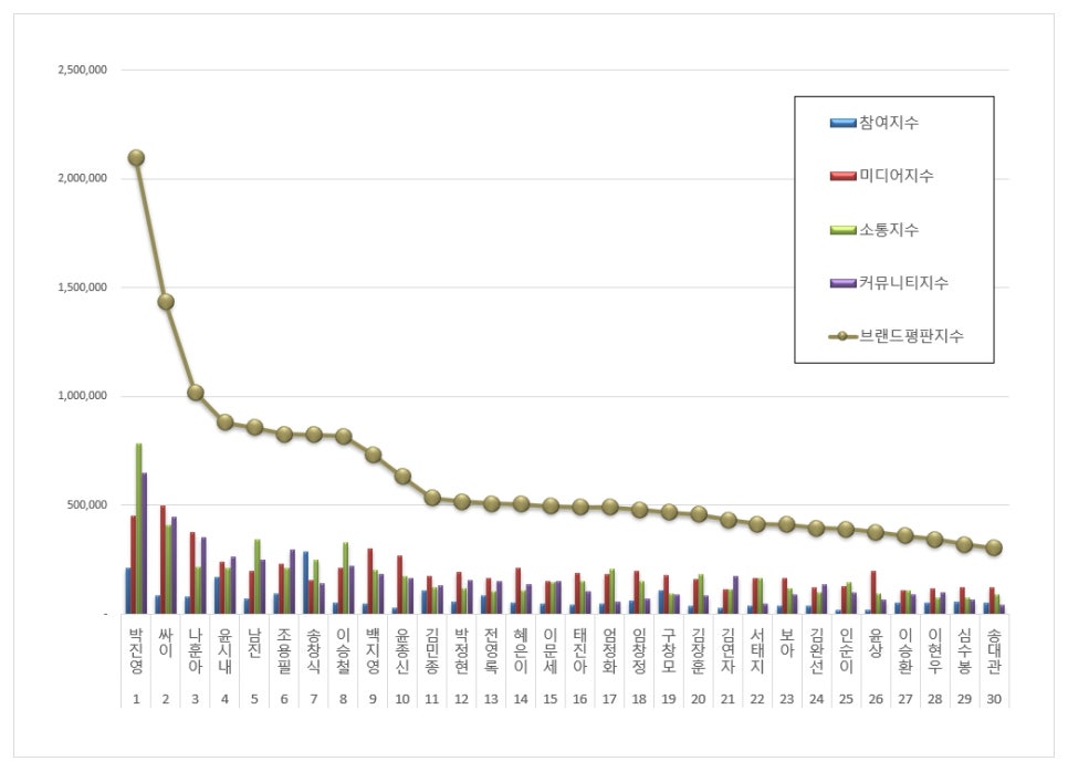 - Park Jin Young : En tête du classement, Park Jin Young a impressionné avec un indice de réputation de 2 094 614. Sa performance dans les indices de participation, de communication et de communauté a connu une augmentation significative, notamment avec la célébration de son 30e anniversaire dans l’industrie musicale. Cette performance témoigne de sa longévité et de sa capacité à captiver les générations à travers les années.